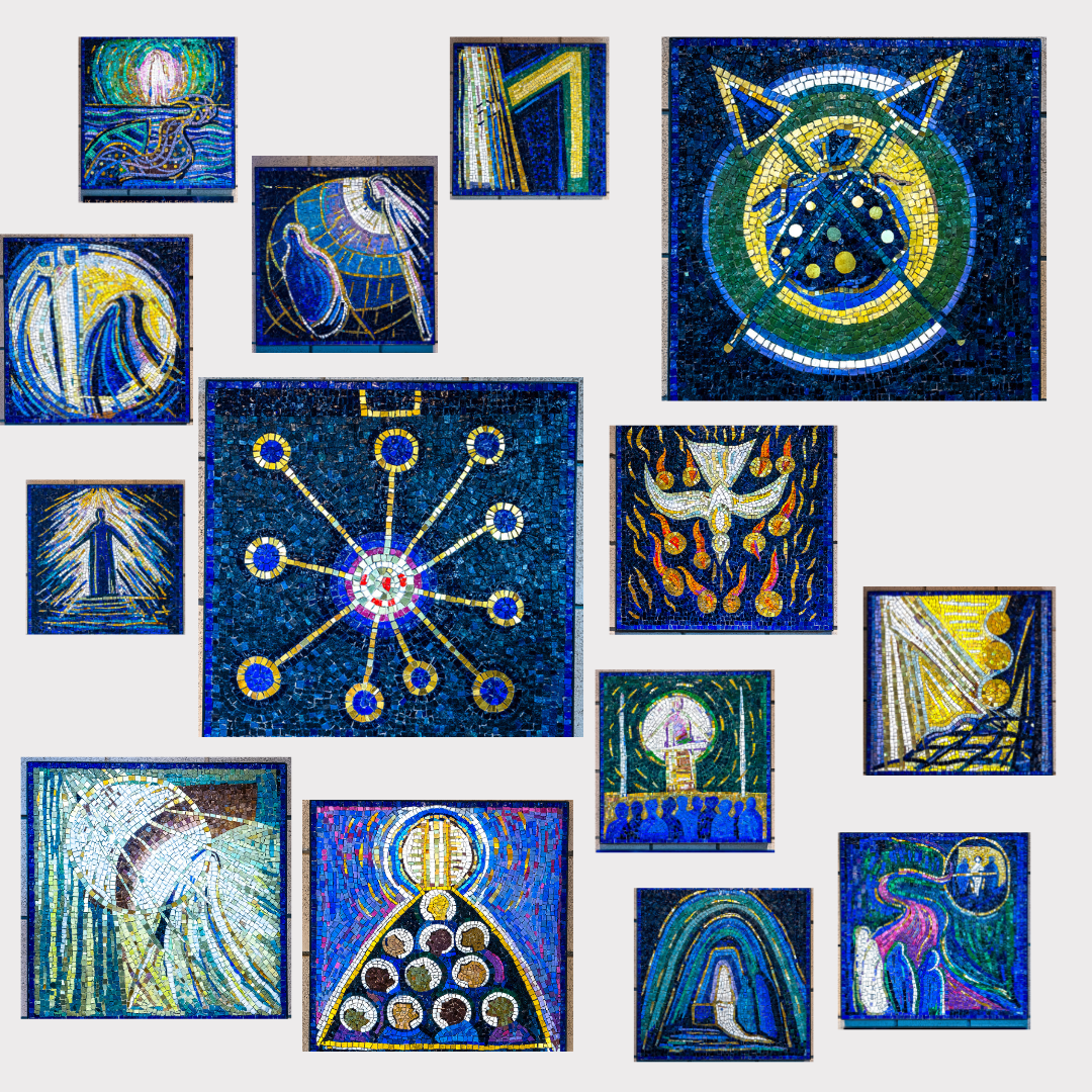 You are invited to walk along the circumference of our Worship Space to pray and reflect on The Stations of the Resurrection. The Stations are presented as fourteen mosaic scenes created by Helen McLean and represent fourteen post-resurrection narratives from the Scriptures. These Stations of the Resurrection are made of colored glass called “smalti” obtained from Venice, Italy. Each mosaic offers an invitation to ponder the mystery of the Resurrection. Each is labeled with a title. A separate book describing these stations and offering accompanying prayers and reflections is available in the Gathering Area.